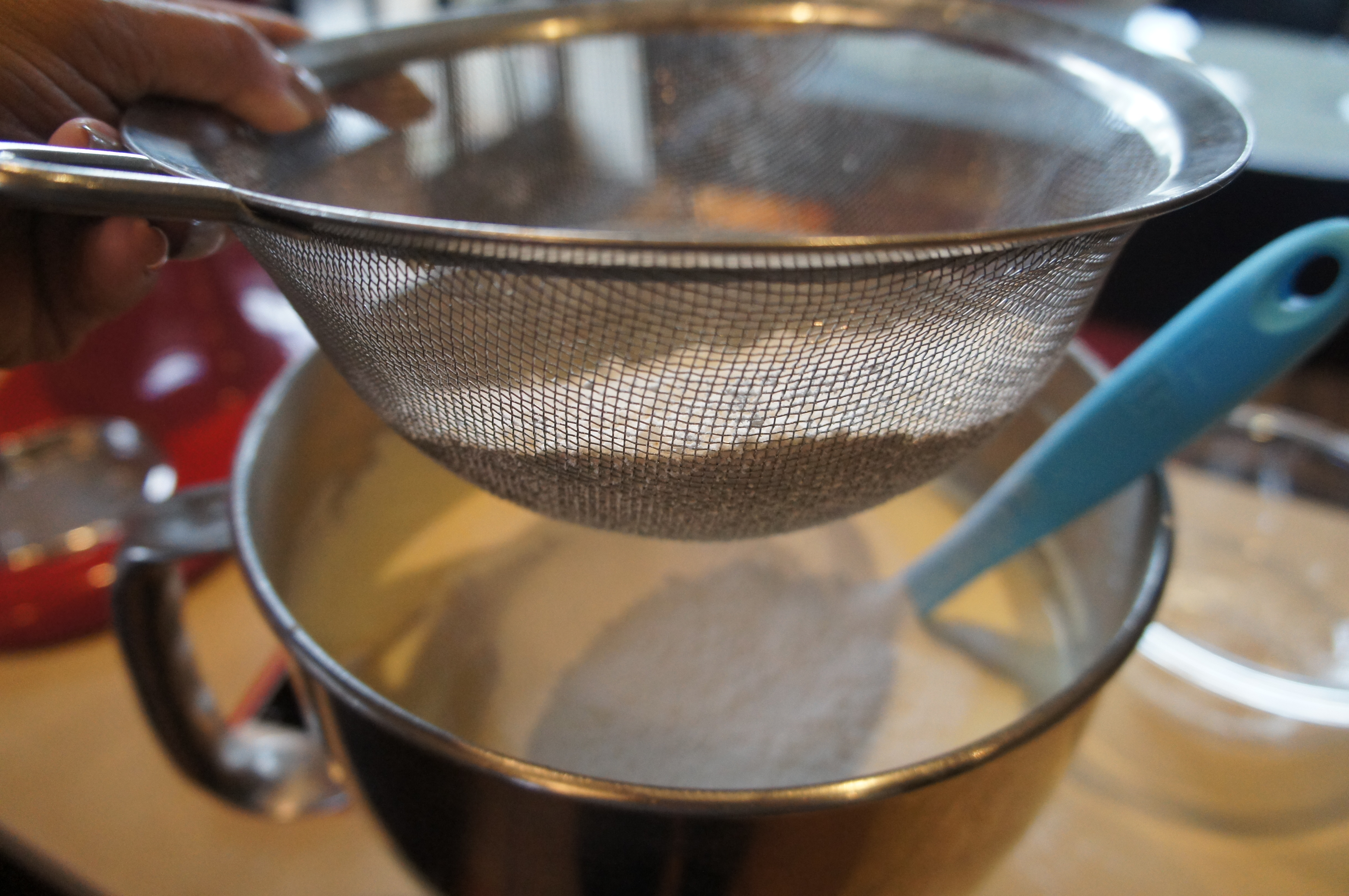 3. Fold the flour into the egg mixture by putting the flour in a sifter or mesh strainer and sifting the flour over the top of the beaten eggs while simultaneously folding the flour in using a whisk. (I used a spatula and it was fine!)